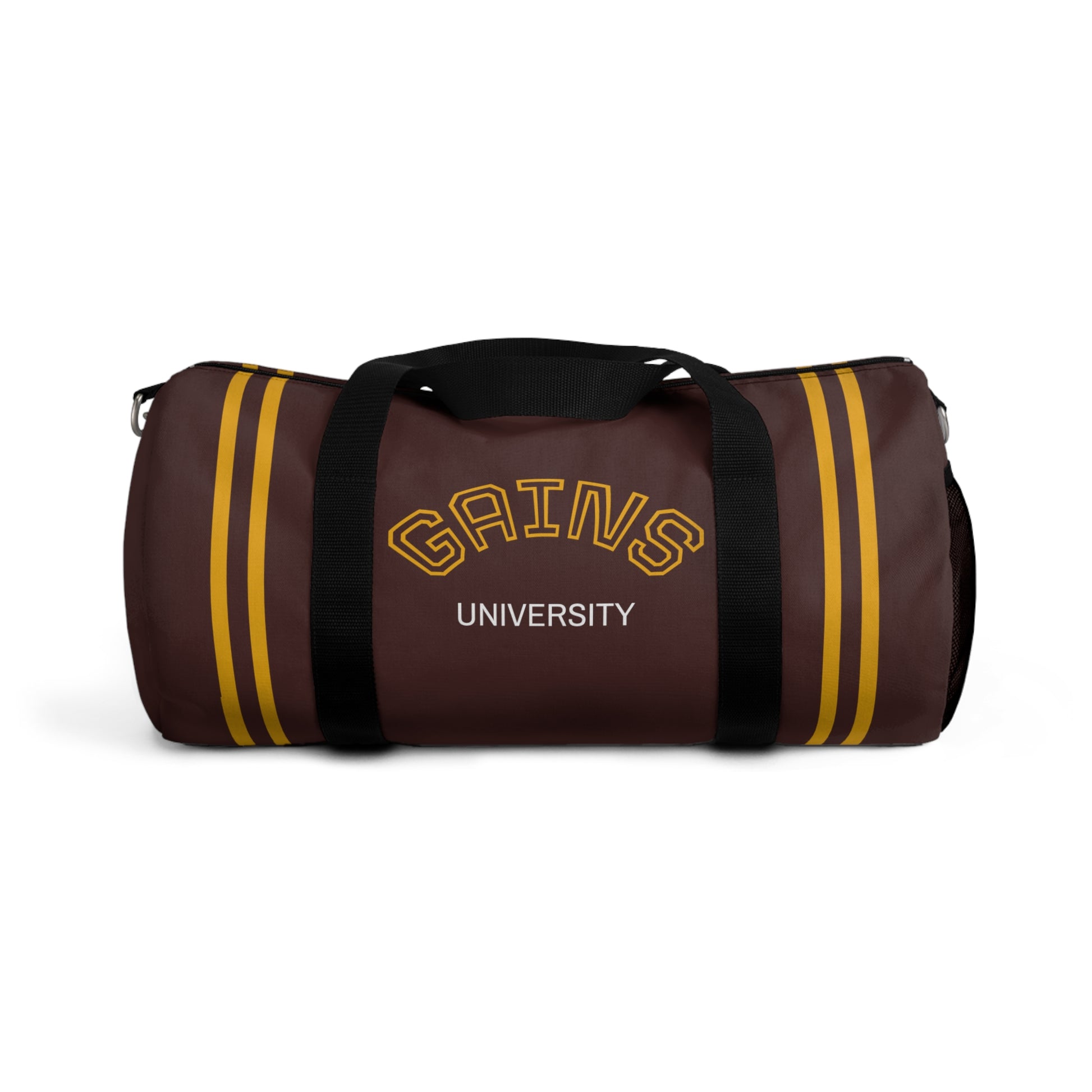 Gains University Duffel Bag — Retro Gym Travel Bag with Athletic Stripe