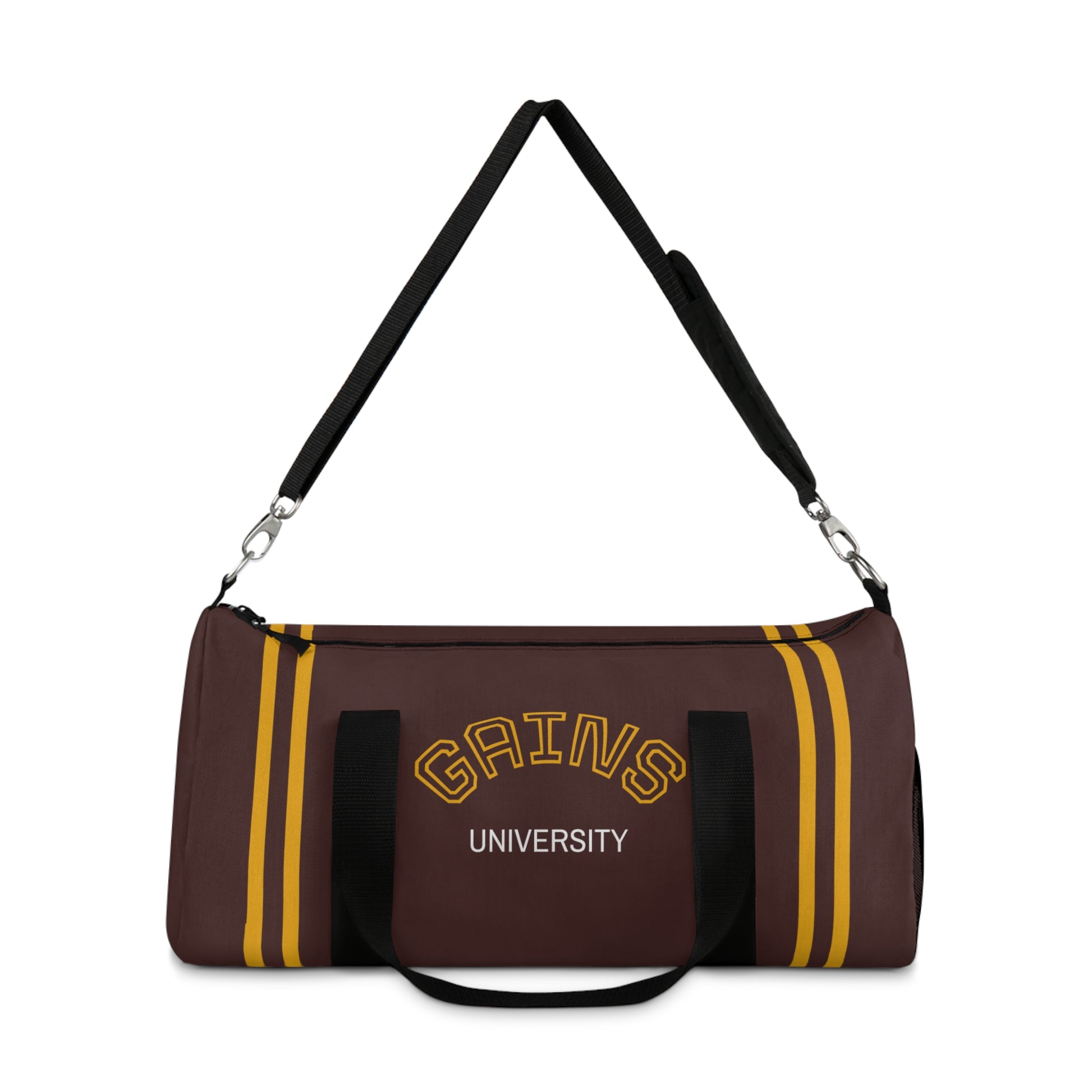 This sporty duffel brings gym energy and campus nostalgia together. Rich brown canvas with bold gold stripes and retro ‘GAINS University’ lettering makes it feel like your favorite old-school locker room — but built for today. Toss your sneakers, shaker bottle, and a change of clothes into the roomy main compartment, zip it up, and sling it over your shoulder with the padded, adjustable strap. An interior zipper pocket keeps small essentials. Rugged polyester construction stands up to daily use and dries fast after sweaty workouts or weekend trips. Available in small